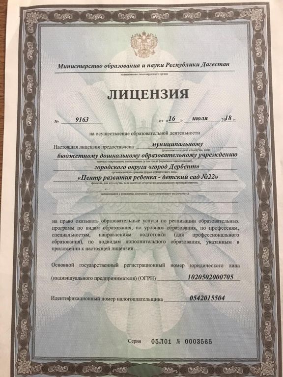| Полное наименование образовательной организации* | Муниципальное бюджетное дошкольное образовательное учреждение городского округа "город Дербент" " Центр развития ребенка детский сад № 22" |